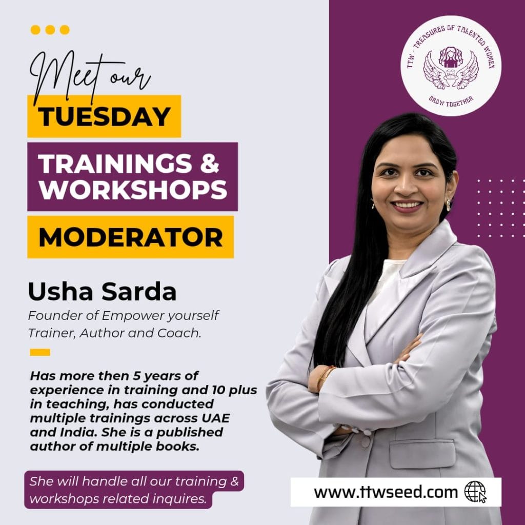 We’re thrilled to welcome Usha Sharda, our amazing moderator for the exciting Tuesday Training Workshop series.